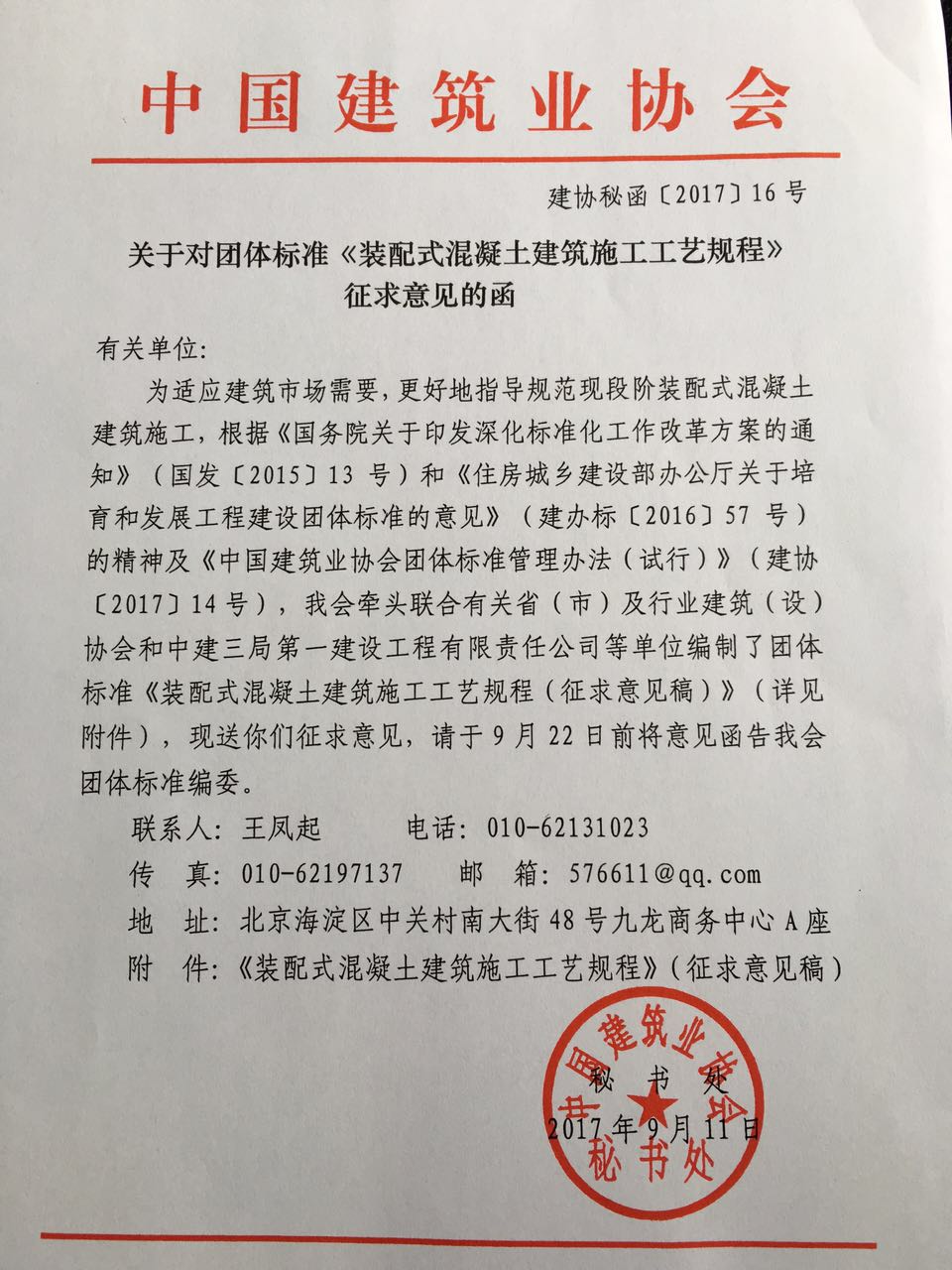 转发中国建筑业协会关于对团体标准《装配式混凝土建筑施工工艺规程》征求意见的函