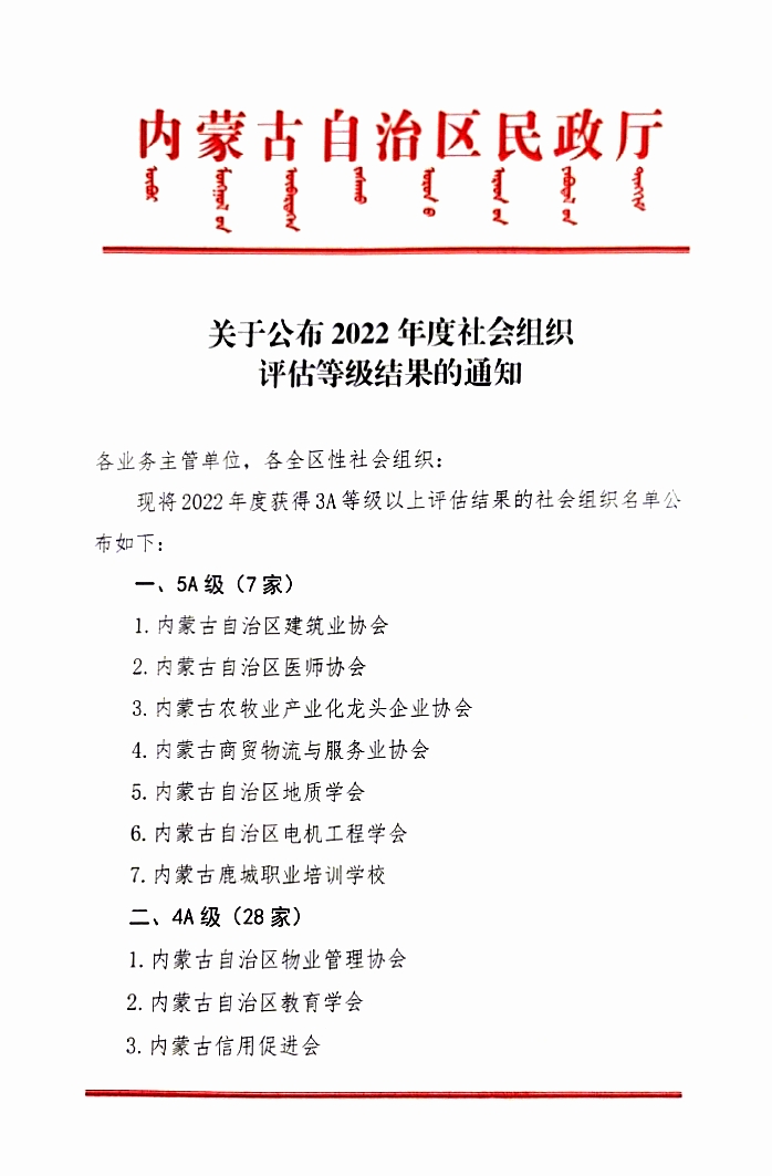 内蒙古自治区民政厅关于公布2022年度社会组织评估等级结果的通知
