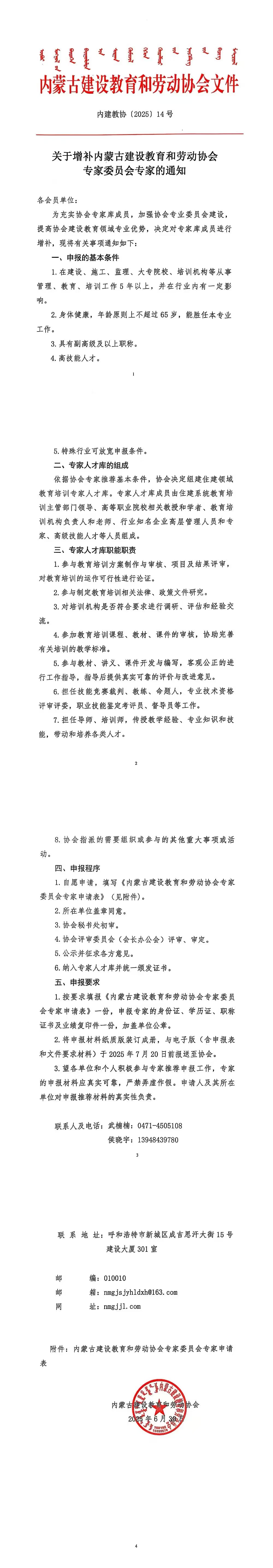 关于增补内蒙古建设教育和劳动协会专家委员会专家的通知